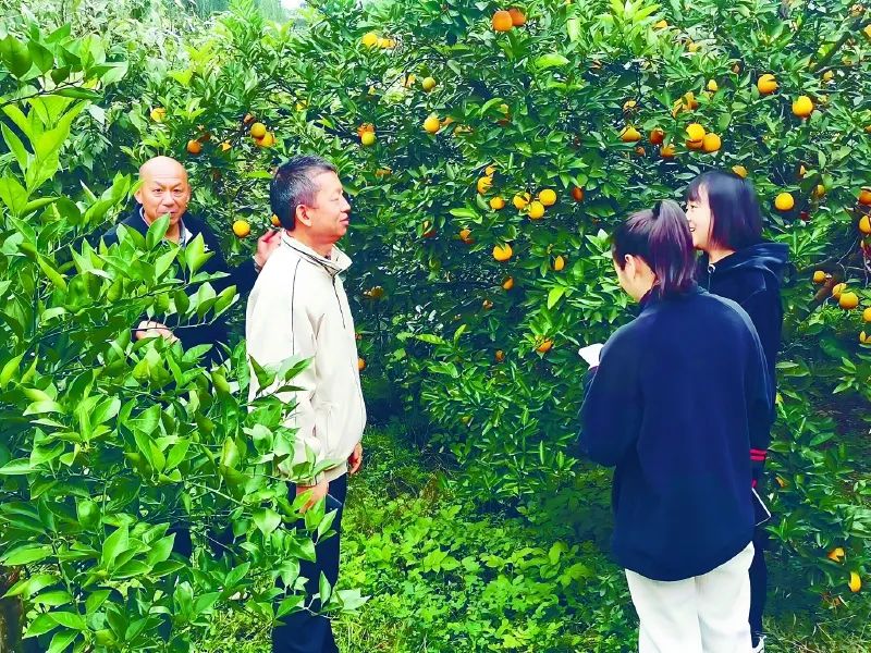 南充佳美食品工业有限公司总经理王在波(左二)查看柑橘生长情况。